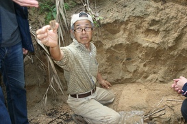 Takamatsu Gushiken, 65, dug up a small fragment of bone on Feb. 15 from one meter down in the earth in Sokei, a...
