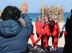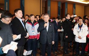 The North Korean cheerleading squad took its first walk through the city of Gangneung, visiting Gyeongpodae Pavilion on Feb. 13. South Korean...