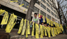 Members of Gwangju Assembly for the Peaceful Resolution of the War Crisis, a coalition of liberal groups, put up ‘peace ribbons’ in Gwangju, in...